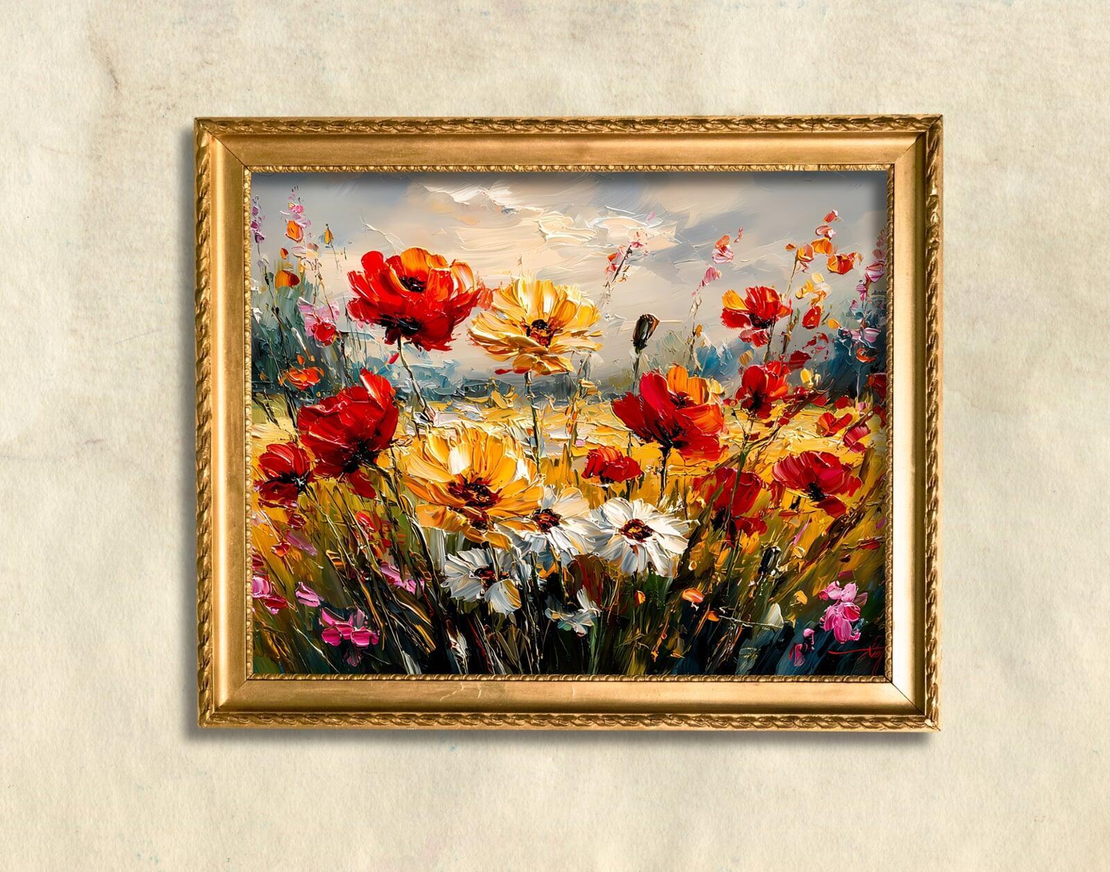 Artists have long been captivated by red's intensity. From the rich Renaissance robes to the dramatic skies of Romanticism, red has been used to convey emotion and draw the eye. However, it was perhaps the Impressionists and Post-Impressionists who truly celebrated red in its most natural, unbridled form: the poppy field. Monet’s 'Poppy Field near Argenteuil' and Van Gogh’s 'Poppy Field' are iconic examples where vibrant reds burst forth from the canvas, capturing the fleeting beauty of a summer’s day. These artists understood that red, when tempered by natural greens and golden light, could create a scene of both tranquility and vibrant life. It is this very spirit that we find embodied in a vibrant red wildflower field art print for bedroom. Such a piece doesn't just add color; it infuses the room with a sense of natural dynamism and a timeless artistic heritage, inviting you to pause and appreciate nature's simple yet profound beauty. The careful interplay of bold red and soft yellow poppies, often highlighted with golden tones and soft painterly textures, creates a visual symphony that resonates deeply, recalling the masters' ability to capture light and emotion.
