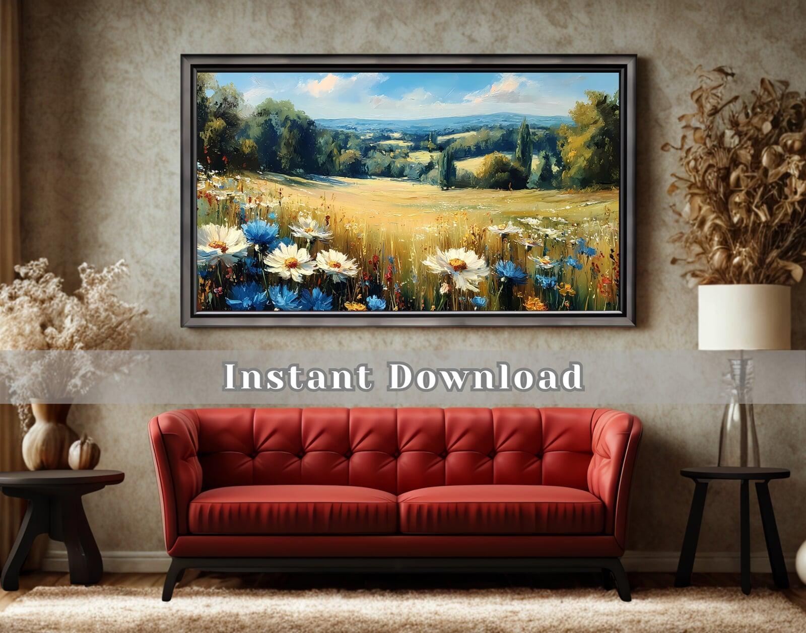 A meadow scene, in particular, holds a special place in this psychological landscape. Unlike towering mountains or crashing oceans, a meadow evokes a sense of openness, safety, and gentle beauty. It's a space of growth and quiet abundance, free from threat, inviting exploration and calm contemplation. Integrating digital landscape art for serene living room settings leverages this inherent connection, turning a functional space into a restorative retreat. The soft focus, the delicate textures of wildflowers, and the expansive sky combine to create an immersive experience that promotes relaxation and mental clarity. It's a simple yet profound way to counteract the urban hustle, offering a visual escape that rejuvenates the spirit every day.